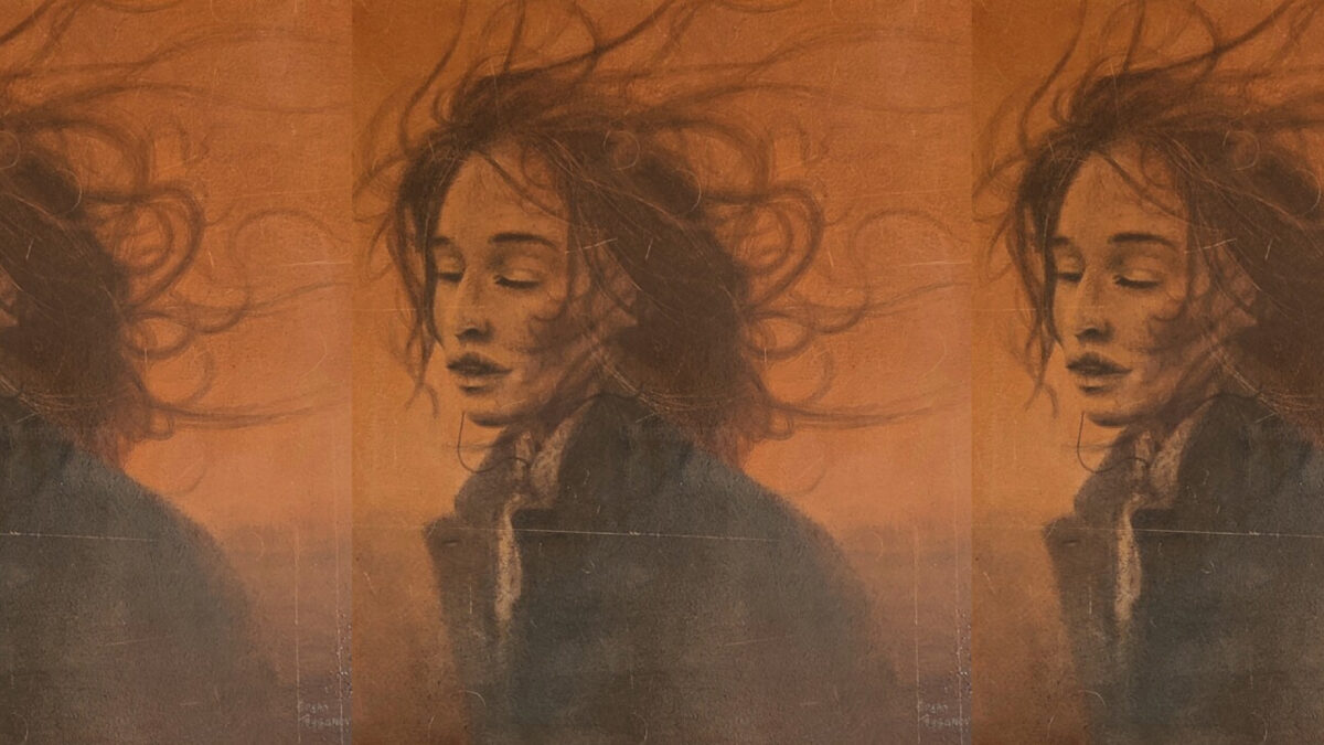 Naine pildil seisab hämaral taustal, pooleldi vaataja poole pööratuna. Tema silmad on suletud ja suu kergelt avatud, justkui vaikses naudingus. Tuul on ajanud tema juuksed keerdu, nii et need lehvivad pea ümber nagu luuderohu juured. Ta ei ole mingi vana aja eksemplar ega ka liigselt modernne oma tumeda mantliga, mille lahtiste hõlmade vahelt paistab hele mustriline sall. Ta on täiesti tavaline naine, keda ma tõenäoliselt kohtaksin Tallinna tänavatel, ja ma olen üsna kindel, et seesama mantel ja sall asuvad praegu minu ema riidekapis. Ometi särab tema argises lihtsuses ilu, mis eirab maali ühetoonilisust.
